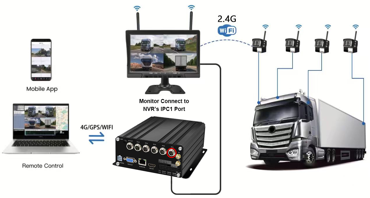 Extra 3CH káblové IP kamerové vstupyCarleader 10,1-palcový 7CH bezdrôtový HDD mobilný NVR systém, špičkový mobilný bezdrôtový NVR systém, ktorý je určený na správu vozového parku. System use 4pcs wireless IP cameras pairing with a 10.1 inch wireelss relay monitor via 2.4GHz signal, then connect the relay montior and NVR IPC port via 6PIN aviation connector, also support extra 3CH wired IP camera inputs.