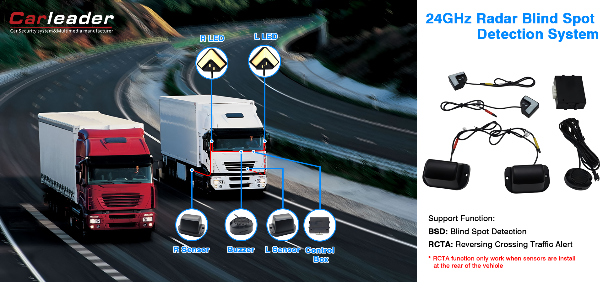 1080P vodotesná zadná kamera s automatickou uzávierkouSystém detekcie slepých plochy Radar Sensor Carleader s 24 GHz Radar Sensor využíva technológiu Radar s výnimočnou vlnou 24 GHz a technológiu superpočítaču na vykonávanie superpočítača na údajoch počas vysokorýchlostnej jazdy, presne detekuje vzdialenosť od ľavého vozidla a zadného vysokorýchlostného blížiaceho sa vozidla a detekciu vozidla v reálnom čase. Keď je vozidlo na nebezpečnom slepom mieste, systém detekcie slepých škvŕn 24 GHz Millimeter BSD slepý spot používa bzučiak a LED zvuk a svetlo alarm, aby okamžite oznámil vodičovi, aby prijal potrebné opatrenia, aby sa predišlo nehodám.