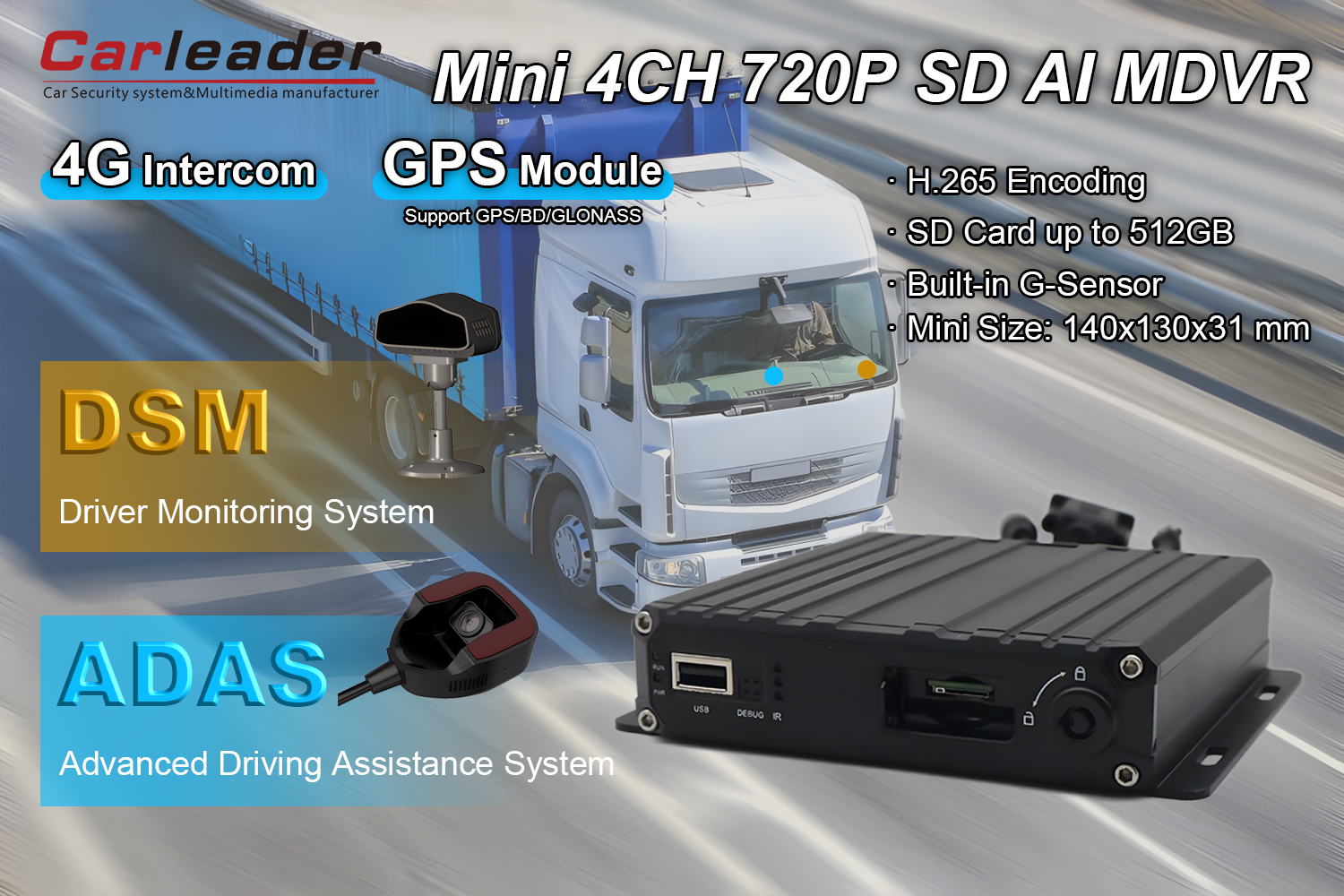 Vedúci4CH AI inteligentný mobilný DVR s DSM a ADAS kamerou, kompaktný a vysokovýkonný 4-kanálovýA mdvr(mobilný digitálny videorekordér) určený pre moderné aplikácie sledovania vozidiel a bezpečnosti. Kombináciou pokročilých schopností AI s robustným dizajnom hardvéru poskytuje toto zariadenie spoľahlivé monitorovanie obrazu v reálnom čase, záznam a inteligentnú analýzu v miniaturizovanom tvare.