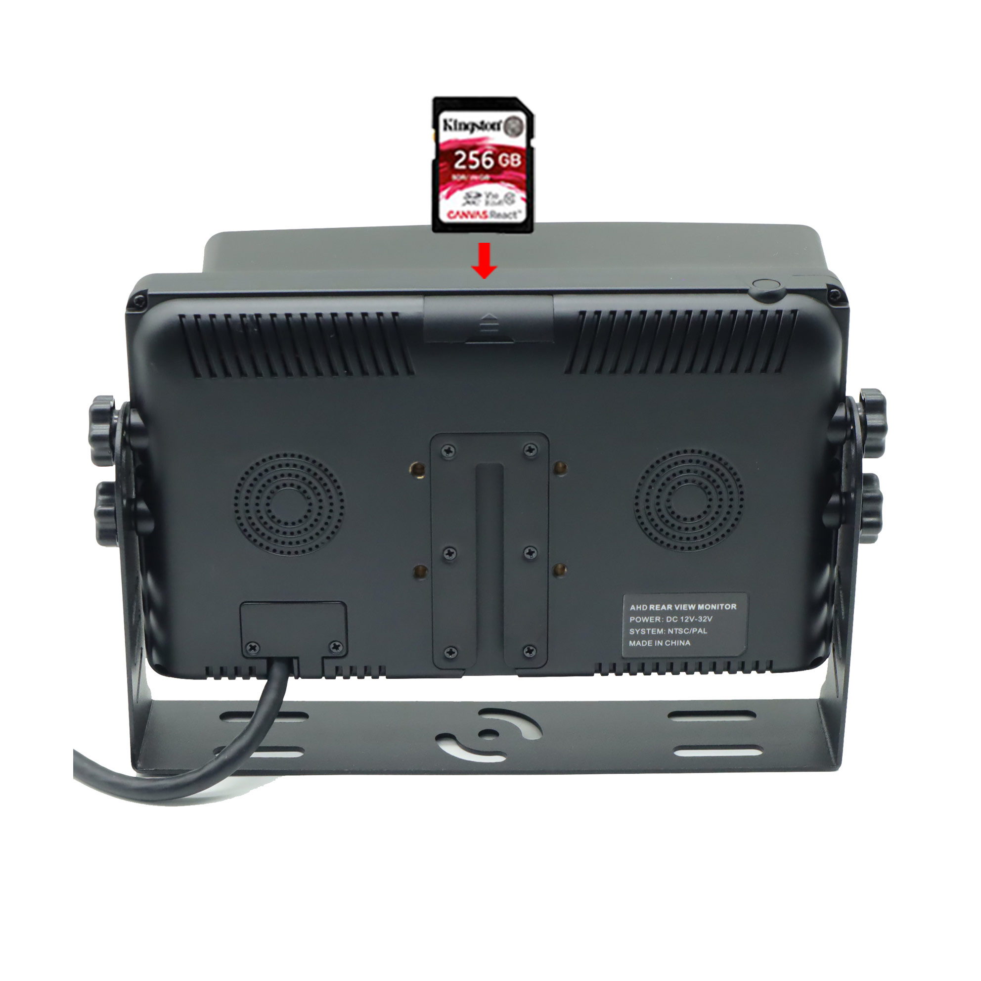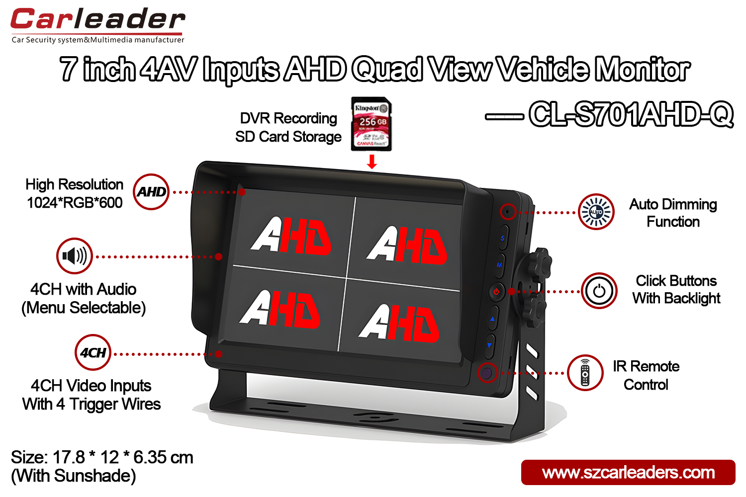 Carleader 7 palcový 4CH AHD vstupy Quad View Display Monitor podporuje funkciu nahrávania DVR, so slotom na kartu SD na zadnej strane monitora, maximálna kapacita je až 256 GB. Funkcie s funkciou nahrávania v slučke umožňujú automatické nahrávanie videa z fotoaparátu a prehrávanie.