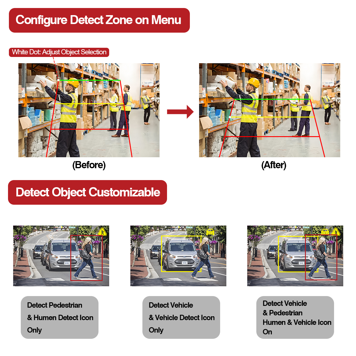 Táto kamera AI so vstavanou funkciou varovného svetla sa farba svetla zmení na zodpovedajúcu farbu, keď sa objekt detekcie dostane do inej oblasti detekcie (červená, žltá, zelená). Integrujte tiež alarm, ktorý upozorní chodcov a vozidlo, ktoré sa blíži k vášmu vozidlu.