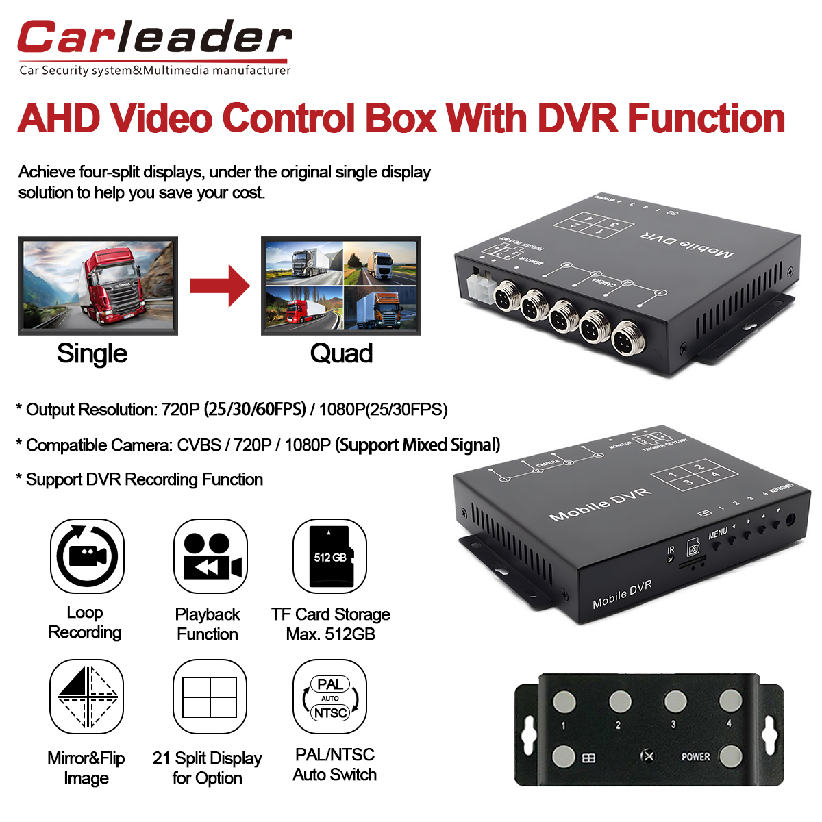 Zvýšte systém sledovania vozidiel pomocouCarleader 1080P AHD Quad Split Display Video Processor Podpora nahrávania videa, všestranný 4CH video splitter box integrovaný s pokročilými možnosťami nahrávania DVR. Táto kompaktná jednotka, navrhnutá na spoľahlivé, flexibilné monitorovanie s vysokým rozlíšením, je ideálna pre správu vozového parku, bezpečnostné vozidlá alebo akúkoľvek aplikáciu vyžadujúcu záznam a zobrazovanie vstupov z viacerých kamier.
