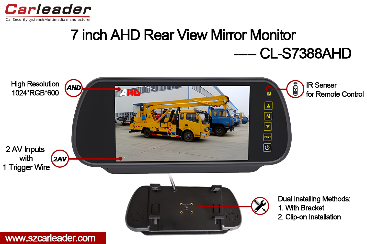 Vedúci7-palcový TFT LCD monitor so spätným zrkadlom AHDje vysokovýkonný 7-palcový monitor AHD so zrkadlom do auta navrhnutý tak, aby poskytoval výnimočnú čistotu a všestrannosť pre moderné systémy monitorovania vozidiel. Kombináciou pokročilých funkcií s užívateľsky prívetivým dizajnom tento monitor zaisťuje spoľahlivý výkon v rôznych jazdných podmienkach.